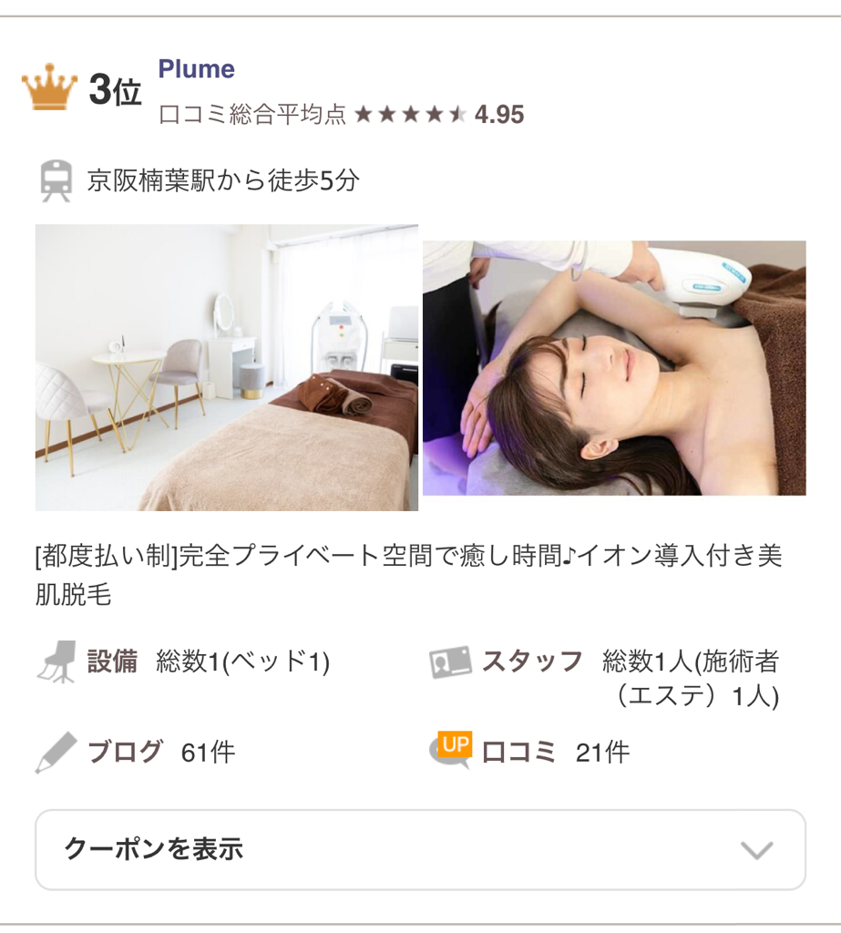 この度枚方市の脱毛サロン口コミランキングにて3位を頂けました!!