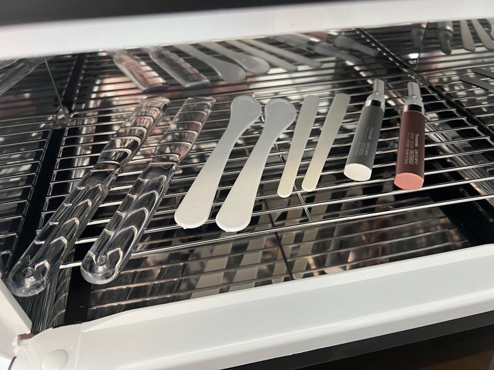 当サロンではお一人お一人施術が全て終わられた後、エタノールで拭き取り消毒をしUVクリーンシステムに並べ器具などに付着した細菌・ウイルス・カビ等の抗菌・除菌を行なっております。