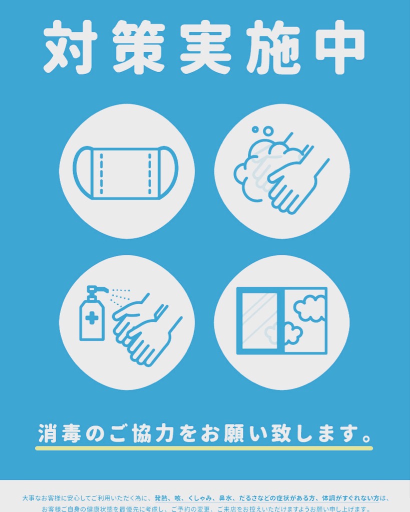 マスクの着用は勿論、施術前後の換気、手指の消毒、施術ベットのタオルやシーツなどもお客様毎に交換、施術道具の消毒、検温等を行なっております。